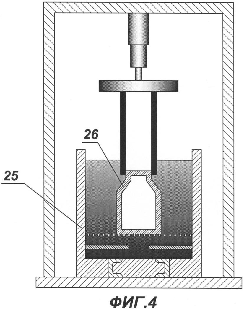 Предварительный нагрев патрубка заготовки трубы-оболочки гидроизоляции из полимерного или полимерсодержащего материала осуществляют в емкости 25, наполненной глицерином, температура которого автоматически поддерживается в пределах 125-145°С, предпочтительно, 134-136°С, причем инерционные отклонения температуры глицерина от заданной не должны превышать 2°С, при этом нагрев глицерина контролируют с помощью двух установленных в центральной части емкости термопар, подключенных к микропроцессорному терморегулятору (не показано), деформацию патрубка заготовки осуществляют путем натяжения его на оправку 26 в течение 15-200 с, после чего осуществляют его выдержку в течение 0,5-3,0 мин и охлаждение изготовленной из патрубка заготовки трубы-оболочки гидроизоляции составной формы, преимущественно, холодной водой по времени в пределах не более 30 мин. После охлаждения осуществляют промыв трубы-оболочки гидроизоляции для удаления следов глицерина, а затем производят просушку и нанесение на наружную поверхность гидроизоляции маркировки с указанием диаметров перехода.