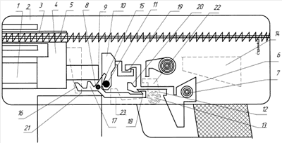 При спущенном курке затворная рама 3 также сцеплена со стволом 1, возвратная 4 и боевая 11 пружины находятся в минимальном поджатии. При нажатии на спусковой крючок 6 последний своим выступом 20 воздействует на спущенный курок 10, отводя его назад и ставя его на шептало одиночного 12 или автоматического огня 8 в зависимости от положения переводчика-предохранителя 14, а затем опрокидывает то шептало, которое вступило во взаимодействие с курком, производя выстрел.
