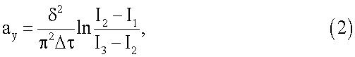 Таким образом, при импульсном нагреве излучением от источника 1 импульсного нагрева поверхности плоского непрозрачного или полупрозрачного для излучения нагрева образца 2 конечной толщины продольная относительно поверхности образца 2 составляющая aX коэффициента температуропроводности материала образца 2, полученная из дифференциального уравнения теплопроводности, представленного в конечных разностях, определяется путем запоминания в момент времени ti+1 температуры Ti1 в точке i, измерения в момент времени t* температур T* i-1, T* i, T* i+1 в точках i-1, i, i+1 соответственно и вычисления величины aX по формуле
