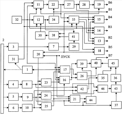 С выхода седьмого интегратора 17 сигнал поступает на первый вход пятого компаратора 26. При равенстве сигналов на входах в момент времени t* пятый компаратор 26 срабатывает. Сигнал с выхода пятого компаратора 26 поступает на вход управления третьего блока деления 40. Третий блок деления 40 срабатывает. Сигнал с выхода третьего блока деления 40, соответствующий отношению F2/F1 в момент времени t* срабатывания пятого компаратора 26, поступает на седьмой В7 выход устройства.