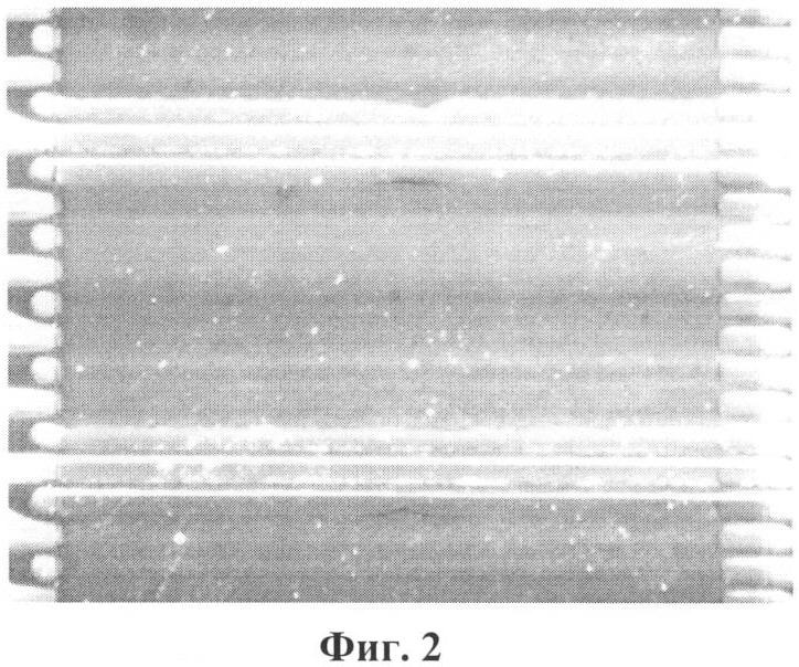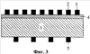 Примером реализации заявляемого устройства служит мультиэлектродный сенсор, изготовленный групповыми методами микроэлектроники согласно схеме фиг.5 на подложке окисленного кремния толщиной около 0,3 мм. На обратной стороне подложки методом магнетронного распыления через теневую маску 8 сформированы несколько нагревателей из платины в виде меандровых дорожек, шириной металлизации около 300 мкм и зазором более 200 мкм. На фронтальную сторону подложки методом магнетронного распыления через теневую маску 9 осажден газочувствительный слой оксида олова, легированного платиной, толщиной около 200 нм. Поверх слоя оксида олова методом магнетронного распыления через теневую маску нанесена система мультиэлектродов из платины – двух крайних полосковых и семи промежуточных измерительных электродов – шириной около 100 мкм, толщиной около 1 мкм и межэлектродным зазором около 70 мкм согласно топологии фиг.1. Измерительные электроды выполнены длиной до 300 мкм на поверхности ГМОС и расположены в шахматном порядке вдоль слоя (четыре электрода с одной стороны слоя, три – с противоположной). Сформированная таким образом подложка разварена в многоштырьковый корпус PGA-120 (Kyocera Co., Япония) с помощью проволочек из золота. Подложка в корпусе закреплена на керамических столбиках.