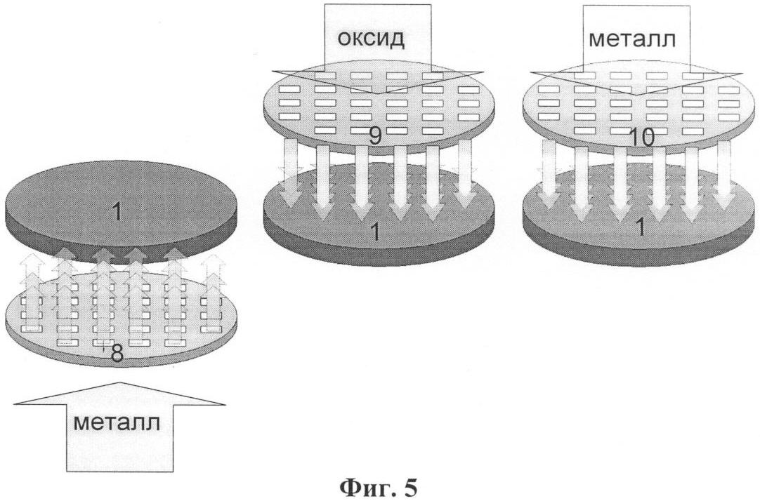 На обратную сторону диэлектрической подложки 1 нанесены нагревательные элементы 5 согласно схеме, приведенной на фиг.5. Нагревательные элементы 5 могут быть сформированы методами микроэлектроники, например, из благородных металлов и/или оксидов металлов. Возможны также варианты расположения нагревательных элементов 5 в промежуточном слое между ГМОС и подложкой или на фронтальной стороне подложки по периметру ГМОС.