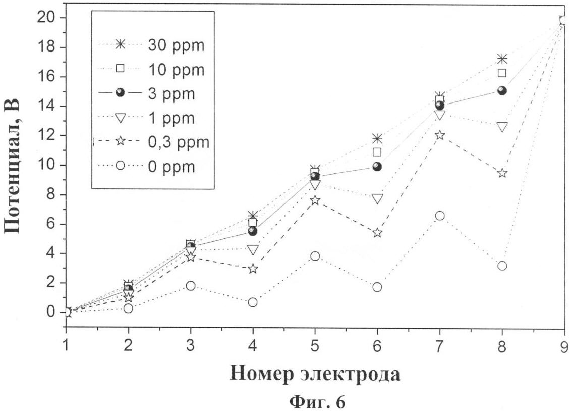 На фиг.6 приведены экспериментальные кривые распределения ЭП вдоль поверхности ГМОС на участке между полосковыми электродами мультиэлектродного сенсора, содержащего 7 измерительных электродов, при приложении к полосковым электродам разности ЭП в диапазоне 0÷+20 В. Кривые соответствуют синтетическому воздуху («0 ppm») и тестовой смеси воздух/изопропанол (концентрация 0,3-30 ppm), измеренные при рабочей температуре нагрева датчика до 300°С. Из фиг.6 видно, что пространственное распределение ЭП вдоль ГМОС зависит от вида и концентрации тестового газа в воздухе. При повышении концентрации тестового газа распределение ЭП приближается к линейному, оставаясь, тем не менее, отличным от него. Важной особенностью пространственных профилей распределения ЭП вдоль ГМОС является их высокая чувствительность к малым концентрациям газов-добавок в чистом воздухе. В частности, распределение ЭП, соответствующее 0,3 ppm концентрации изопропанола, уверенно «отделяется» от распределения ЭП в чистом воздухе. Эта высокая чувствительность является результатом того, что форма кривой распределения ЭП отражает коллективную перестройку сопротивлений локальных участков ГМОС около измерительных электродов под влиянием малых изменений в составе окружающей атмосферы. Аналогичные результаты получены и при воздействии газовых смесей воздуха с толуолом.
