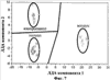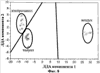 Результаты обработки распределений ЭП (фиг.6), соответствующих воздействию смесей воздуха с изопропанолом и толуолом (в концентрации 0,3-30 ppm) на мультиэлектродный сенсор в режимах квазиоднородного и неравномерного нагрева ГМОС, методом ЛДА представлены на фиг.7, 8. Эллипсы соответствуют кривым плотности вероятности 0,99 нормального распределения проекций ЭП, полученных при воздействии на ГМОС калибровочных тестовых газов, на ЛДА-плоскость вокруг проекций средних значений ЭП. Точками изображены обработанные методом ЛДА распределения ЭП, записанные при последующих воздействиях тех же тестовых газов. Прямые линии служат для дискриминации классов. Из фиг.7, 8 видно, что образы (эллипсы) двух тестовых газовых смесей уверенно разделяются. После проведения калибровки мультиэлектродного сенсора мультисенсорные сигналы, регистрируемые при воздействии отмеченных двух калибровочных тестовых газов, локализуются в областях ЛДА-пространства, соответствующих этим газам и, тем самым, идентифицируются. Приложение неравномерного нагрева как дополнительного фактора вариации свойств локальных участков ГМОС около измерительных электродов сохраняет расстояние между кластерами, соответствующими двум тестовым газам, но увеличивает расстояние между кластерами, соответствующими чистому воздуху и тестовым газам (фиг.8).