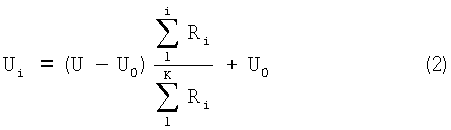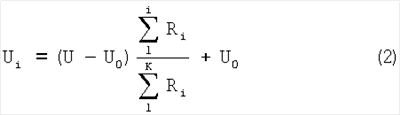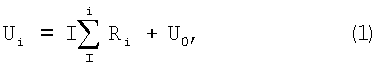 где i – индекс (номер) участка ГМОС при его разбиении на сегменты общим количеством k; Ri – сопротивление i-го сегмента, которое зависит от полного распределения ЭП Uj и локальной температуры; I – протекающий через сегмент ток. Учитывая, что полное падение ЭП равно разности (U-U0), то
