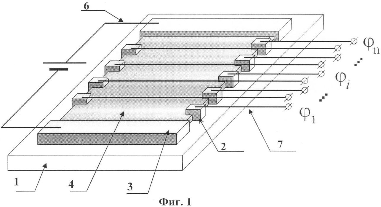 Поверх ГМОС нанесены, например, методом катодного и/или магнетронного распыления через маску 10 (фиг.5), длинные полосковые электроды 3, выполненные, как правило, из благородных металлов с подслоем титана, и короткие измерительные электроды 2. При этом полосковые электроды 3 расположены по краям ГМОС 4 и служат для приложения электрического напряжения вдоль поверхности ГМОС, а измерительные электроды 2 расположены вдоль ГМОС между полосковыми электродами 3 и позволяют регистрировать распределение ЭП (фиг.1). Полосковые электроды 3 снабжены выводами 6 для подключения к источнику напряжения, а измерительные электроды 2 снабжены выводами 7 для подключения к устройству измерения ЭП, например мультиметру. Полосковые электроды имеют омический контакт с ГМОС, что позволяет поддерживать в слое необходимый для измерений ток.
