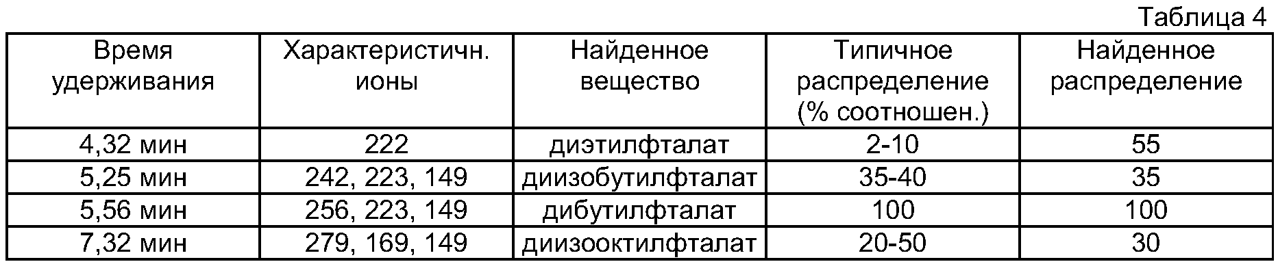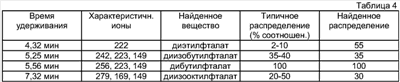 В контрольной пробе неизвестное вещество не было обнаружено. По базе данных найденное в исследуемой водке неизвестное вещество представляет собой диэтилфталат. В то же время диэтилфталат и другие эфиры фталевой кислоты являются типичными представителями лабораторных загрязнений (инжекторы, посуда и т.п.) и поэтому для квалифицированного определения происхождения найденного диметилфталата требуется провести контрольное определение уровня лабораторных загрязнений. Анализ ведут при следующих параметрах: 100°C (1 мин), 35°C/мин, 300°C, (20 мин), колонка HP-5MS. Результаты анализа лабораторных загрязнений представлены в Таблице 4. По результатам анализа квалифицировать обнаруженное в исследуемой водке неизвестное вещество – диметилфталат – квалифицируют как маркер непищевого происхождения, денатурирующая добавка к спирту. Как видно из описания и приведенных примеров осуществления способа, заявляемое техническое решение обеспечивает возможность однозначной идентификации химических соединений и их фрагментов, позволяет установить происхождение указанных химических соединений при одновременном повышении точности и оперативности определения. Источники информации 1. RU 2093822 С1, М.кл. G01N 30/04, опубл. 1997 г. 2. RU 2069363 С1, М.кл. G01N 30/02, опубл. 1996 г. 3. WO 2004/104571, М.кл. G01N 30/00, опубл. 2004 г. 4. ЕР 1846757 А2, М.кл. G01N 30/86, опубл. 2007 г. – ближайший аналог.