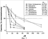 На фиг.2 представлена зависимость степени гемолиза, выраженной в % к максимальному (т.е. к гемолизу, наблюдаемому без присутствия антиоксидантов). Суспензию эритроцитов преинкубировали в течение 10 мин с разными концентрациями антиоксидантов, затем добавляли клотримазол, 10 µМ и третбутиловую гидроперекись, 2 mМ и инкубировали в течение 3 ч, n=5-20.