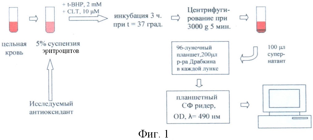 К 1 мл 5% суспензии эритроцитов добавляют исследуемый антиоксидант в разных концентрациях, преинкубируют 20 мин, после чего вносят 10 µл взвеси клотримазола, конечная концентрация клотримазола 10 µМ, после чего сразу вносят 20 µл 100 мМ раствора третбутиловой гидроперекиси (t-BHP), конечная концентрация 2 мМ.