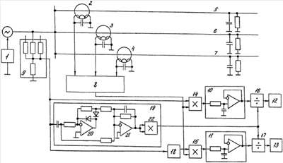 Фильтры 10, 11, включающие интегрирующие цепи и развязывающие усилители, подавляют высокочастотные и выделяют низкочастотные составляющие этих напряжений. Низкочастотная составляющая на выходе фильтра 10 пропорциональна активной мощности, выделяющейся на сопротивлении R изоляции на частоте наложенного тока. Низкочастотная составляющая на выходе фильтра 11 пропорциональна реактивной мощности на емкости С изоляции. На выходе блока 19 формируется напряжение, соответствующее квадрату эффективного значения входного напряжения – . В делителе 16 вычисляется отношение , пропорциональное сопротивлению R изоляции, в делителе 17-отношение , пропорциональное емкостной проводимости (а при фиксированной частоте – емкости изоляции). Индикаторы 12, 13 отображают соответствующие значения сопротивления и емкости изоляция контролируемой линии. Для подавления напряжения рабочей частоты на выходах датчиков 2, 3, 4 могут быть включены конденсаторы, образующие с выходной обмоткой датчика резонансный контур, настроенный на частоту накладываемого тока. Аналогично в фильтре 9 в качестве элемента, включенного между общей шиной и средней точной, также может использоваться параллельный резонансный контур, настроенный на ту же частоту. При стабильном напряжении источника 1 выходное напряжение блока 19 постоянно, что делает его наличие в устройстве необязательным. Соответственно упрощаются делители 16, 17.
