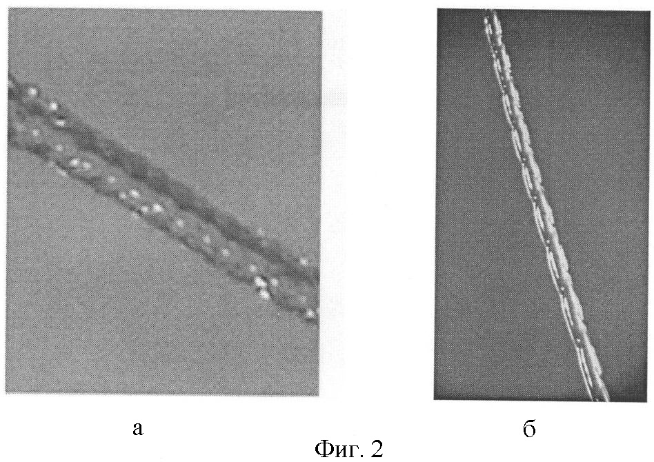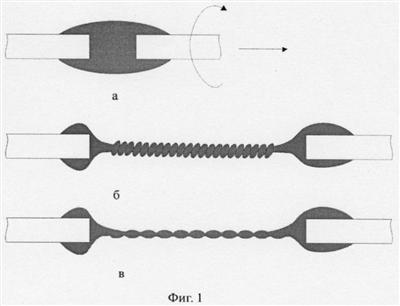 Сущность изобретения поясняется фиг.1 и фиг.2. На фиг.1, а схематично показана капля раствора или расплава полимера, расположенная на совмещенных торцах двух стержней или стеклянных волокон. На фиг.1, б показано сформированное спиральное волокно после растяжения и скручивания капли полимера. На фиг.1, в показано сформированное спиральное волокно после его обработки путем смачивания растворителем либо нагрева. На фиг.2, а показано сформированное спиральное волокно из поливинилацетата. На фиг.2, б показано сформированное спиральное волокно из полиуретана.