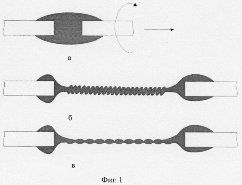 Пример 2. В качестве стержней используют два отрезка волокна из кварцевого стекла диаметром 130 мкм. Каплю расплава полиуретана (Тразм=193°С) объемом 3 мм3 помещают между торцами совмещенных волокон (фиг.1, а). Одно из волокон удаляют от другого волокна со скоростью 1 мм/с с одновременным вращением волокна вдоль оси со скоростью 0.8 об/с. В результате формируется полимерное волокно в виде спирали с плотно упакованными витками (фиг.1, б). Затем полимерное волокно нагревают до температуры 200°C в течение 5 с и охлаждают до комнатной температуры. При этом происходит сплавление поверхностей соседних витков спирали и формируется сплошное полимерное волокно со спиральной гофрированной поверхностью (фиг.1, в). Фотография волокна показана на фиг.2, б. Диаметр волокна равен 100 мкм, период спирального гофра равен 300 мкм, высота гофра – 20 мкм. При увеличении продолжительности нагрева до 10 с высота гофра уменьшается до 10 мкм.
