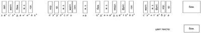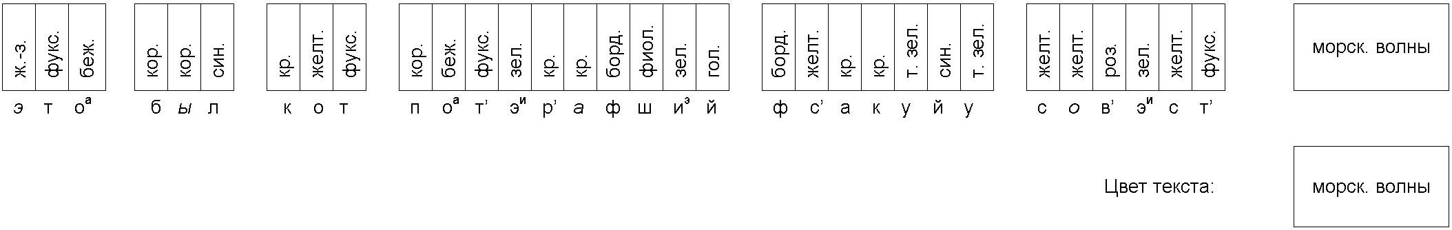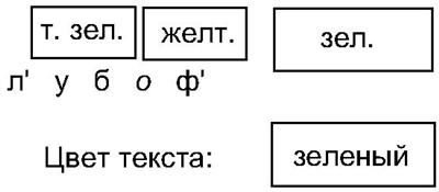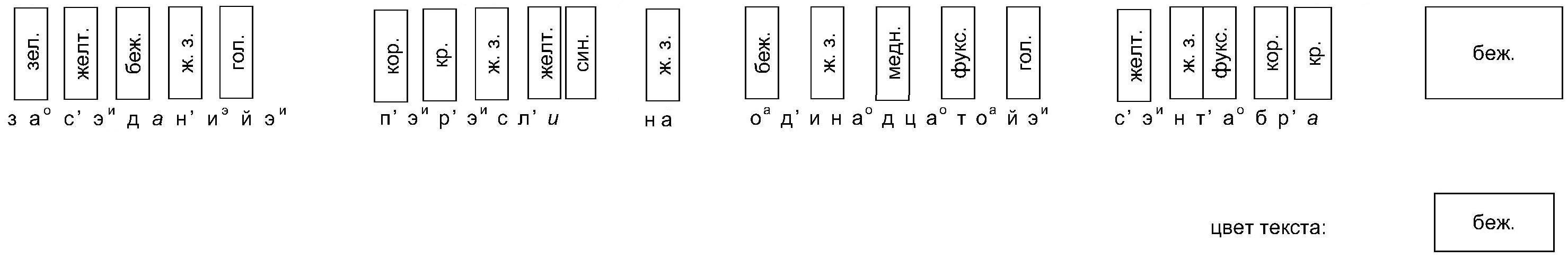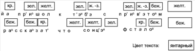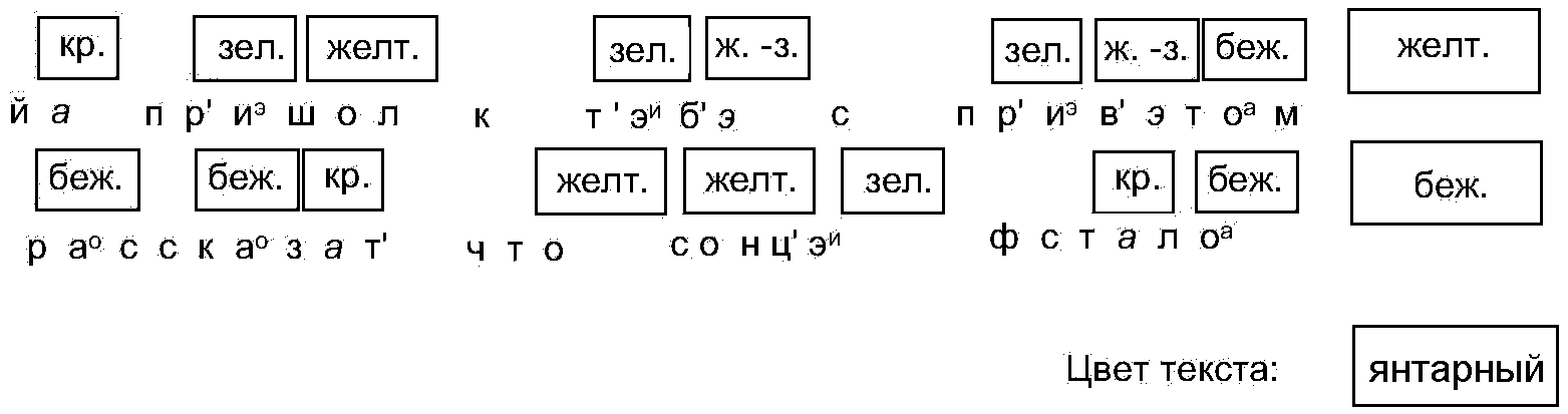 1. Способ анализа текста, включающий запись анализируемого текста, выделение в записанном анализируемом тексте множества букв, определение ассоциативных характеристик, соответствующих каждой букве из выделенного множества букв, и построение ассоциативного аналога анализируемого текста, содержащего совокупность полученных ассоциативных характеристик, отличающийся тем, что анализируемый текст записывают в форме его фонетической транскрипции таким образом, чтобы каждому отдельному звуку соответствовала отдельная буква, а названное множество букв выделяют из названной записанной буквами фонетической транскрипции анализируемого текста. 2. Способ по п.1, отличающийся тем, что выделенное множество букв включает буквы, соответствующие гласным звукам фонетической транскрипции анализируемого текста. 3. Способ по п.1, отличающийся тем, что выделенное множество букв включает буквы, соответствующие гласным звукам фонетической транскрипции анализируемого текста и «й». 4. Способ по п.1, отличающийся тем, что выделенное множество букв включает буквы, соответствующие согласным звукам фонетической транскрипции анализируемого текста. 5. Способ по п.1, отличающийся тем, что выделенное множество букв включает все буквы фонетической транскрипции анализируемого текста. 6. Способ по п.1, отличающийся тем, что при построении ассоциативного аналога анализируемого текста ассоциативные характеристики располагают аналогично соответствующим им буквам. 7. Способ по п.1, отличающийся тем, что записанная фонетическая транскрипция содержит служебные знаки, обозначающие мягкость или длительность, или характер звука, к которому служебный знак относится. 8. Способ по п.1, отличающийся тем, что в анализируемом тексте предварительно определяют ударные звуки и при построении ассоциативного аналога текста учитывают весовые коэффициенты ассоциативных характеристик в зависимости от ударности звуков, которым они соответствуют. 9. Способ по п.1, отличающийся тем, что при записывании анализируемого текста в форме его фонетической транскрипции сложные звуки представляют как совокупность простых звуков с учетом позиционного влияния звуков в тексте друг на друга. 10. Способ по п.1, отличающийся тем, что ассоциативной характеристикой является цвет. 11. Способ по п.1, отличающийся тем, что ассоциативными характеристиками являются словесные качественные характеристики – семантические дифференциалы. 12. Способ по п.1, отличающийся тем, что определение ассоциативных характеристик, соответствующих каждой букве из выделенного множества, осуществляют путем сопоставления каждой буквы с базой данных соответствия букв и ассоциативных характеристик. 13. Способ по п.1, отличающийся тем, что в анализируемом тексте определяют ударные слова, а в ассоциативном аналоге текста учитывают весовые коэффициенты ассоциативных характеристик, соответствующих этим словам. 14. Способ по п.1, отличающийся тем, что анализируемым текстом является одно слово. 15. Способ по п.1, отличающийся тем, что анализируемым текстом является одно предложение. 16. Способ по п.1, отличающийся тем, что буквы, которыми записан анализируемый текст и фонетическая транскрипция, относятся к одному алфавиту, 17. Способ по п.1, отличающийся тем, что буквы, которыми записан анализируемый текст и фонетическая тран