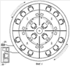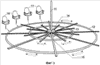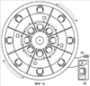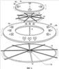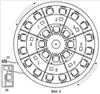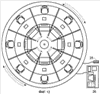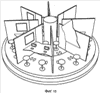 а) центровой рабочий элемент устройства: Фиг.3 – внутреннее колесо 13 со стульями 17 внутреннего ряда (и далее Фиг.2) вместе с центровой частью пола 19 с фотонными следками 20 и центровыми секциями перегородок 21а;