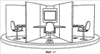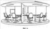 – рабочие места учащихся: а) места не комплектуются Фиг.14; б) в кабинках размещается, по меньшей мере, один комплект аппаратуры лингафонной, компьютерной, тренажерной линий: Фиг.8; в) полная комплектация рабочих мест: Фиг.10, Фиг.12, Фиг.15, Фиг.16, Фиг.17.