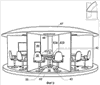 13. Устройство по п.1, отличающееся тем, что внешний рабочий элемент установки – внешнее металлическое колесо и расположенные и жестко закрепленные на нем внешняя часть подвесного пола с фотонными следками, внешние секции звукоизолирующих перегородок, внешний ряд стульев, столы с подъемными столешницами и техническими средствами – выполнен с возможностью периодического перемещения на расстояние одной кабинки, при этом центровой рабочий элемент установки находится в статике, и так до тех пор, пока внешняя вращающаяся часть установки не совершит полный оборот по кругу.