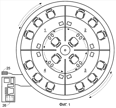 б) внешний рабочий элемент устройства: Фиг.3 – внешнее колесо 12 со стульями 16 внешнего ряда (далее Фиг.2) вместе с внешней частью пола 18 с фотонными следками 20 и закрепленными на ней внешними секциями перегородок 21b, столами 22 и средствами обучения 23 и 24.