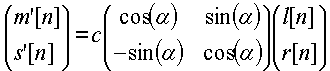 Хотя Уравнение 3 эффективно относится к повороту сигналов l[n], r[n] на угол 45°, возможны другие углы поворота, как показано в Уравнении 4 (Eq. 4), где представляет собой угол поворота, применяемый к сигналам l[n], r[n] для генерации соответствующих кодированных сигналов m'[n], s'[n], описанных далее в настоящем описании, в качестве основного и остаточного сигналов соответственно: