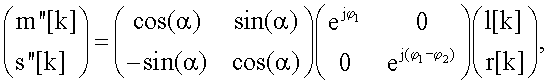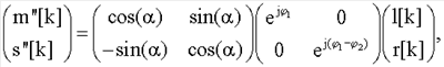 Способ настоящего изобретения, выполняющий действия по обработке сигнала, как показано Уравнением 11 (Eq.11) для преобразования частотного представления сигналов l[k], r[k] из Уравнений 7 и 8 в соответствующие повернутые суммарный и разностный сигналы m”[k], s”[k] в частотном домене: