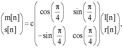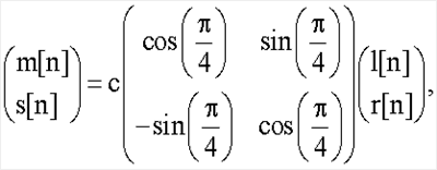 В M/S кодировании, сигнал состоит из левого и правого сигналов l[n], r[n], которые соответственно являются кодированными в виде суммарного сигнала m[n] и разностного сигнала s[n], например, путем применения обработки, описанной Уравнениями 1 и 2 (Eq. 1 and 2):