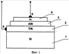 Данный ППД УФИ изготовлен следующим образом. На кремниевую подложку 1 наносят монтажный слой 2 нитрида титана реактивным магнетронным распылением титановой мишени на постоянном токе 2 А в азотсодержащей газовой среде (Аr 70 объем. %; N2 30 объем. %) при давлении 1 Па и температуре подложки 330°С в течение 12 мин. Выращенный слой TiN имеет толщину 0,6 мкм и удельное сопротивление 40 мкОм·см. Немедленно по окончании данной операции на той же технологической установке при том же значении температуры, давления и состава газовой смеси на монтажный слой 2 наносят фоточувствительный слой 3 нитрида алюминия магнетронным распылением алюминиевой мишени на переменном токе частотой 13,56 МГц при мощности разряда 500 Вт в течение 6 ч. Толщина выращенного слоя A1N составляет 0,5 мкм. Плотность сквозных дефектов в нем не более 10000 см-2. По месту присоединения вывода 5 к слою 2 слой 3 вытравливают слабым раствором КОН. Далее на открытой поверхности фоточувствительного слоя 3 формируют платиновый выпрямляющий электрод 4, образовав барьер Шотки между данным электродом и фоточувствительным слоем 3.