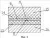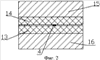 Количество полосок, их длина и ширина могут варьироваться в зависимости от конструкции делителя, его рабочего диапазона частот и других параметров. На фиг.5 представлена конфигурация полосковых проводников широкополосного делителя мощности, выполненного на полосковых линиях и имеющего участок связи между его выходными линиями. На фиг.6 изображено его поперечное сечение вдоль оси симметрии. Полосковые линии 1, 2, 3 и резистор 4 расположены на верхней поверхности тонкой диэлектрической подложки 6, а на ее нижней поверхности расположены полоски 8 и 9. Полоска 8 расположена напротив резистора 4, а полоска 9 перекрывает зазор 10 между связанными линиями. Выходные линии 1 и 2 содержат по три трансформирующие секции 7, 11 и 12, обеспечивающие согласование входа делителя в широкой полосе частот. Зазор 10 между выходными линиями уменьшается в направлении от выходов к резистору 4, обеспечивая согласование между резистором и выходами в широкой полосе частот. Тонкая подложка 6 расположена между толстыми диэлектрическими подложками 13 и 14, поддерживающими ее посередине между экранами 15 и 16, которые являются вторыми проводниками полосковых линий и полностью их экранируют, предотвращая излучение. Размеры полосок 8 и 9 подбираются так, чтобы противофазная составляющая обратного сигнала максимально поглощалась в резисторе 4 и не попадала на выход линии 2 во всей рабочей полосе частот. Введение полосок 8 и 9 позволило обеспечить развязку между выходами делителя выше 20 дБ в полосе 8-18 ГГц.