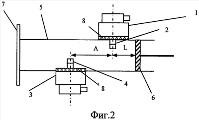 При синфазном включении магнетронов, когда они работают в одни и те же промежутки времени, каждый из них воздействует друг на друга в рабочем режиме. К уменьшению взаимного влияния до величин, обеспечивающих устойчивую работу, приводит оптимизация положения вывода энергии в волноводе, которая осуществляется за счет установки дополнительных проставок 8 между магнетроном и волноводом. Это позволяет обеспечить синхронизацию работы магнетронов на одной частоте при синфазном включении.