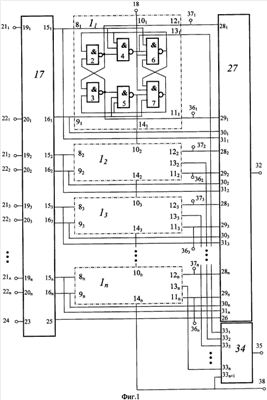 Схема индикации окончания начальной установки счетчика (фиг.3) состоит из элементов 2ИЛИ-2И-НЕ 431-43n и (n+1)-входового гистерезисного триггера 44, первый, второй, третий и четвертый входы элемента 2ИЛИ-2И-НЕ 43i, i=1, , n, соединены со входами 29i, 30i, 28i и 31i соответственно, а его выход подключен к i-му, i=1, , n, входу гистерезисного триггера 44, (n+1)-ый вход которого соединен со входом 26, а выход – с выходом 45.