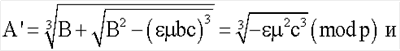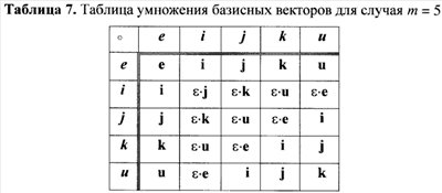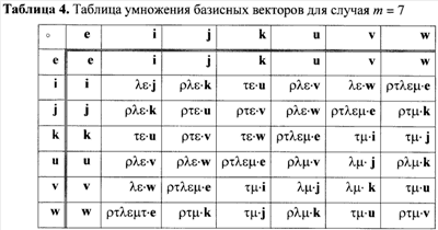 Равенство нулю главного определителя этой системы для некоторых троек значений (a, b, с) задает вектора aе+bi+cj, для которых не существуют обратных элементов. Таким образом, получаем следующее характеристическое уравнение a3-3 Используя формулу Кардано [Курош А.Г. Курс высшей алгебры.- М., Наука, 1971. – 431 с.] и обозначение В=( Из исследования характеристического уравнения вытекают следующие типовые варианты структур рассматриваемого множества трехмерных векторов. Случай 1. Число 3 не делит p-1. Существует единственное значение кубичного корня для всех значений подкоренного выражения. В этом случае число корней характеристического уравнения определяется значением его детерминанта D=-27( Если Случай 2. Число 3 делит p-1 и каждое из произведений В рассмотренных случаях 1 и 2 множества трехмерных векторов образуют алгебраическое кольцо с операциями сложения и умножения векторов. Векторные конечные поля в этих случаях не образуются, так как не для всех векторов существуют обратные значения. Случай 3. Число 3 делит р-1 и каждое из произведений Например, при просто p=604884627778815030120967 и коэффициентах растяжения µ=1 и Аналогично построению конечных полей трехмерных векторов можно построить поля многомерных векторов. Для того чтобы множество m-мерных векторов составляло поле GF(pm), следует выбирать поле GF(p), для характеристики которого выполняется условие делимости m|р-1 (т.е. значение m делит нацело значение р-1). Кроме того, в соответствующую таблицу умножения базисных векторов надо ввести коэффициент растяжения Случай m=4. Определим операцию умножения четырехмерных векторов aе+bi+cj+dk с помощью таблицы 6, которая обеспечивает свойство коммутативности и ассоциативности. Задавая различные конкретные значения коэффициентов растяжения, можно задавать различные варианты полей GF(p4). Для простого p=670657405878917 и коэффициента растяжения Случай m=5. Определим операцию умножения пятимерных векторов aе+bi+cj+dk+gu с помощью таблицы 7. При простом р=268675256028581 и коэффициенте растяжения Таким образом, мы показали способ построения векторных конечных полей GF(pm) для различных значений р и m, что обосновывает отличительный признак заявленного изобретения, заключающийся в том, что генерируют ЭК над конечным полем, являющимся векторным конечным полем. В примере 1 последовательность действия по генерации и проверке ЭЦП в соответствии с заявленным способом имеет следующий вид: генерируют ЭК, которая представляет собой совокупность точек ЭК, заданных в виде пар векторов, принадлежащих векторному конечному GF(p5), описанному выше (см. случай m=5) и удовлетворяющих уравнению Y2=Х3+ZaX+Zb (генерация ЭК состоит в задании векторов Za и Zb); методом генерации случайной равновероятной последовательности формируют секретный ключ в виде МДЧ k; формируют открытый ключ Р в виде двух векторов XP и YP, являющихся координатами точки Р, принадлежащей ЭК, для чего генерируют точку G, принадлежащую ЭК и имеющую значение порядка, равное q, и затем генерируют точку Р по формуле Р=kG; принимают ЭД, представленный МДЧ Н; генерируют случайное МДЧ 0 формируют ЭЦП Q в виде пары МДЧ (r, s), для чего генерируют МДЧ r по формуле r=F(R), где F(R) – некоторая функция с целочисленными значениями, аргументом которой являются координаты точки ЭК (например, r=F(R)=xR1xR2xR3xR4xR5 mod q, где XR=(xR1,xR2,xR3,xR4,xR5) – абсцисса точки R, представляющая собой пятимерный в