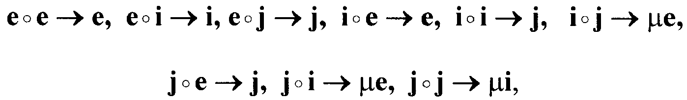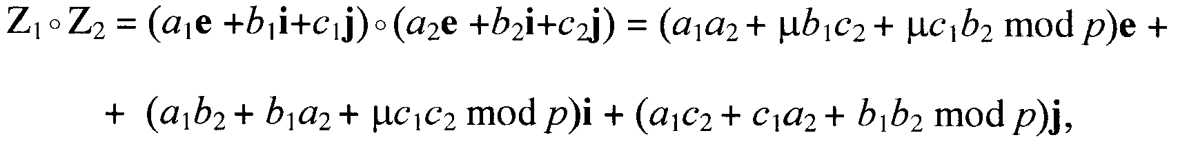 Пример 1 Данный пример иллюстрирует частный вариант реализации заявленного способа, соответствующий пп.1 и 2 формулы изобретения. В этом примере при формировании и проверке подлинности ЭЦП реализуется та же последовательность действий, что и в случае с прототипом, за исключением того, что генерируется ЭК, заданная над векторным конечным полем GF(pm), где p>3 и m – значение размерности векторов. При этом генерируется ЭК в виде множества точек, координаты которых Х и Y удовлетворяют уравнению Y2=Х3+ZaX+Zb, где X, Y, Za и Zb – вектора, принадлежащие векторному полю GF(pm), которое аналогично уравнению ЭК в случае прототипа. Данное уравнение задает ЭК над любым конечным полем, характеристика которого равна простому числу p>3. Формулы для вычисления суммы двух точек ЭК А и В с координатами соответственно (XA, YA) и (XB, YB), где XA, YA, XB и YB вектора, принадлежащие векторному полю GF(pm), также являются аналогичными и имеют вид: XC=K2-XA-XB и YC=K(XA-XC)-YA, где Рассмотрим варианты векторных конечных полей, которые могут быть использованы в рассматриваемом примере частной реализации заявленного способа. При m=3 общие правила умножения базисных векторов, обеспечивающие свойства коммутативности и ассоциативности операции умножения векторов, представлены в таблице 5, где (aе+bi+cj)o(xe+yi+zj)=(ax+ из которого видно, что вопрос существования обратных значений сводится к вопросу существования решений системы уравнений вида: