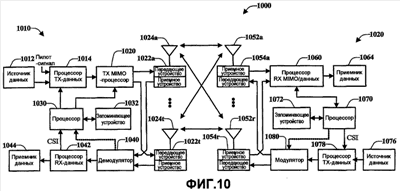 В системе 1010 передающего устройства модулированные сигналы из системы 1050 приемного устройства принимаются посредством антенн 1024, приводятся к требуемым параметрам посредством приемных устройств 1022, демодулируются посредством демодулятора 1040 и обрабатываются посредством процессора 1042 RX-данных, чтобы восстановить CSI, сообщенный посредством системы приемного устройства. Сообщенный CSI далее предоставляется в процессор 1030 и используется для того, чтобы (1) определять скорости передачи данных и схемы кодирования и модуляции, которые должны быть использованы для потоков данных, и (2) формировать различные средства управления для процессора 1014 TX-данных и TX MIMO-процессора 1020.