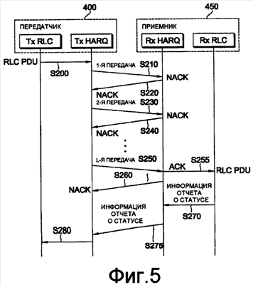 Во избежание растраты радиоресурсов Rx RLC строит информацию отчета о статусе и передает информацию отчета о статусе на Rx HARQ (S270). Rx HARQ передает информацию отчета о статусе на Tx HARQ (3275). Информация отчета о статусе – это информация, которая передается с приемника 450 на передатчик 400 и включает в себя информацию о блоке данных, принятом приемником 450, и блоке данных, не принятом приемнике 450. Информация отчета о статусе может строиться на уровне RLC или на уровне MAC. Приемник 450 может разрешать включать в информацию отчета о статусе только информацию о блоке данных, не принятом приемником 450. Поскольку потеря данных на физическом уровне очень мала благодаря использованию HARQ, передача приемником 450 всей информации о блоке данных, принятом приемником 450, и блоке данных, не принятом приемником 450, может быть неэффективна. Дополнительно, когда приемник 450 также должен передавать информацию о блоке данных, успешно принятом приемником 450, в ответ на запрос от передатчика 400, приемник 450 может передавать блок данных, имеющий наибольший порядковый номер среди последовательно принятых блоков данных.
