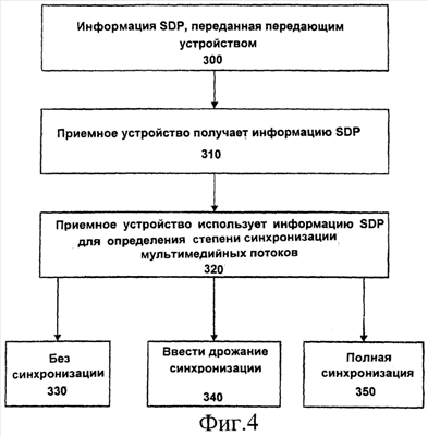 [0046] Фиг.4 представляет собой общую блок-схему, показывающую реализацию варианта осуществления настоящего изобретения, в котором передающее устройство может указывать либо не выполнять синхронизацию, либо устанавливать определенное значение дрожания синхронизации. На этапе 300 на фиг.4 передающее устройство передает информацию SDP. Указанная информация SDP включает инструкции описанных выше типов в отношении синхронизации передаваемых мультимедийных потоков. На этапе 310 приемное устройство получает указанную информацию SDP. На этапе 320 приемное устройство считывает информацию SDP для определения того, содержится ли в ней указание не выполнять синхронизацию какого-либо или всех мультимедийных потоков, установить определенное значение для дрожания синхронизации или же выполнить полную синхронизацию. Если есть указание не выполнять синхронизацию, то выполняется переход на этап 330. Если задано значение дрожания синхронизация, то к потоку применяет заданное значение дрожания на этапе 340. Если же отсутствуют инструкции касательно отмены синхронизации, или не указано дрожание синхронизации, или есть конкретная инструкция на выполнение полной синхронизации, то осуществляется полная синхронизация на этапе 350.