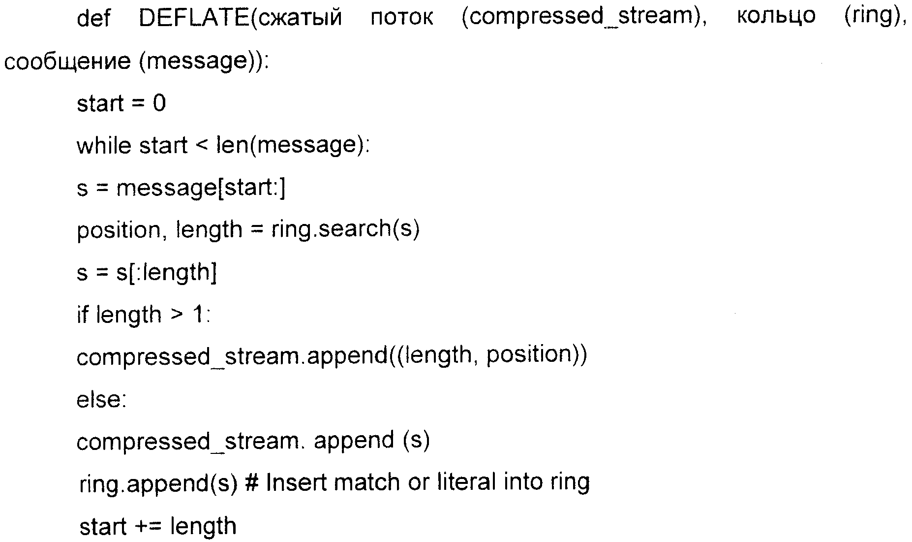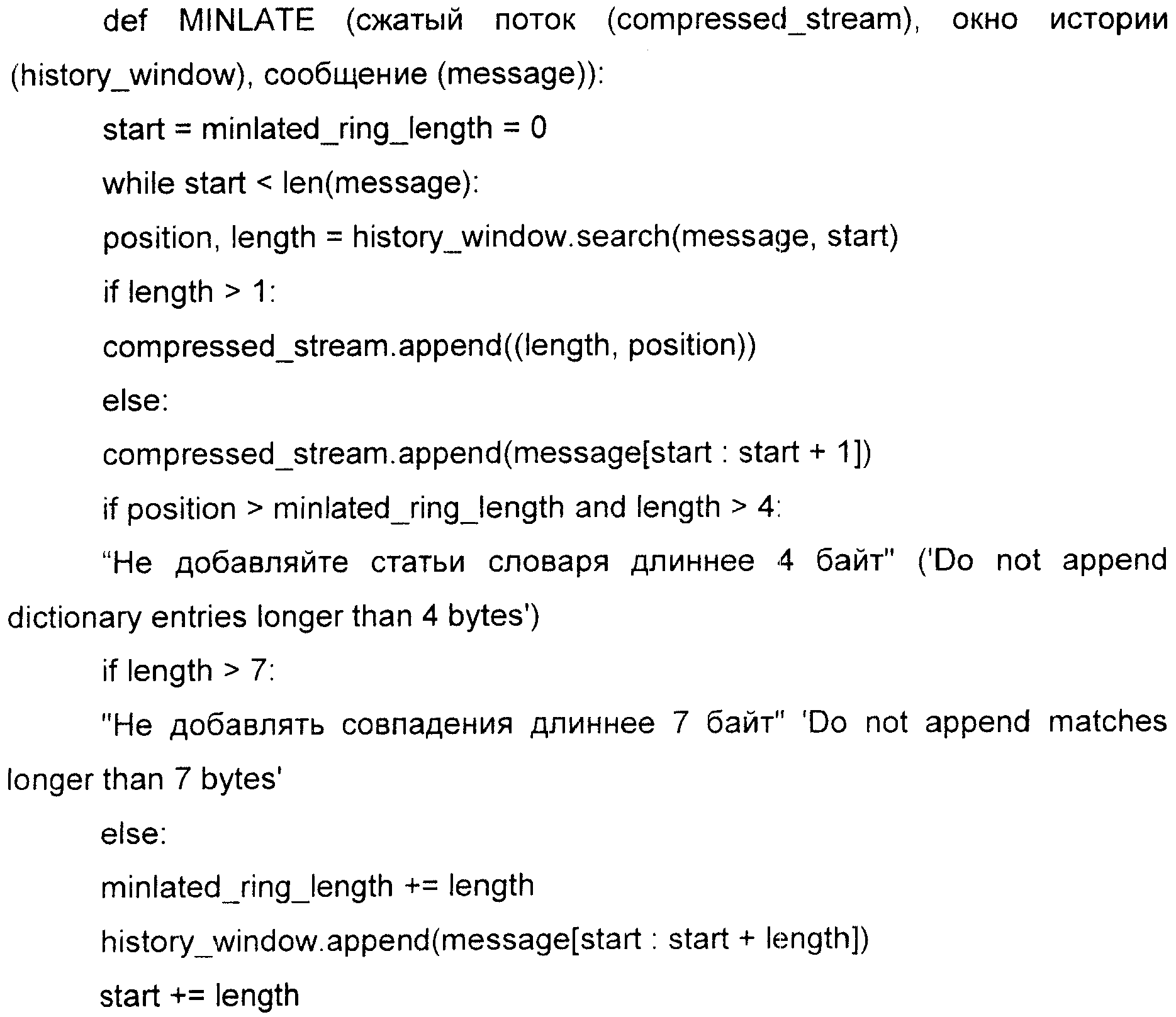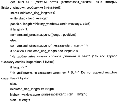 Ниже описан пример способа сжатия со ссылкой на псевдокод. В этом примере код режима работы miniate (программа дефляции длины минимального состояния) ищет выбранные части сообщения в части окна истории (history_window) и выводит сжатый поток (compressed_stream). Если есть совпадение, производится проверка положения и длины, чтобы определить, превышают ли они порог длины для ячеек словаря и не словаря, чтобы определить, следует ли дополнить history_window (кольцевой буфер).