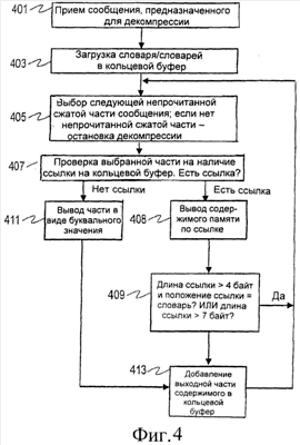 На следующем шаге 405 выбирается следующая непрочитанная сжатая часть сообщения. Если больше нет непрочитанных сжатых частей, работа останавливается.