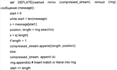 Далее для справки показан упрощенный пример алгоритма сжатия DEFLATE, который определен в RFC 1951: