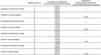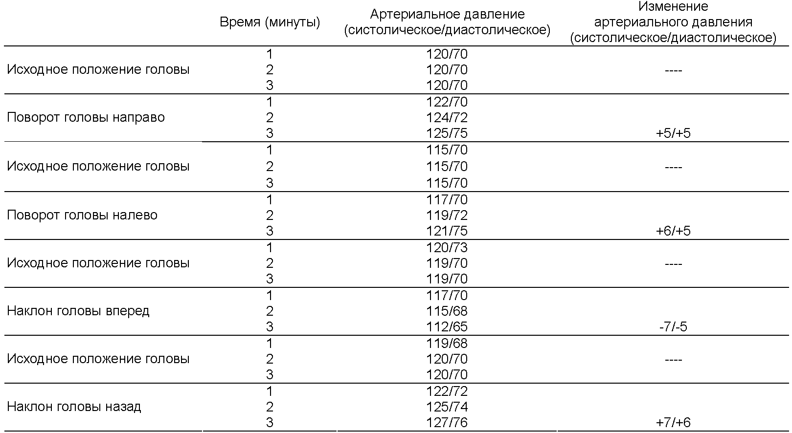 Все двигательные маневры головы-шеи проводят в зафиксированном прямом положении туловища. Каждый позиционный этап исследования завершают возвращением головы в исходное – прямое положение с восстановительным периодом 3 минуты. Производят сопоставление полученных результатов с установленными показателями артериального давления при повороте головы направо, повороте головы налево, наклоне головы вперед, наклоне головы назад у здоровых (таблица 1).