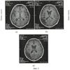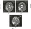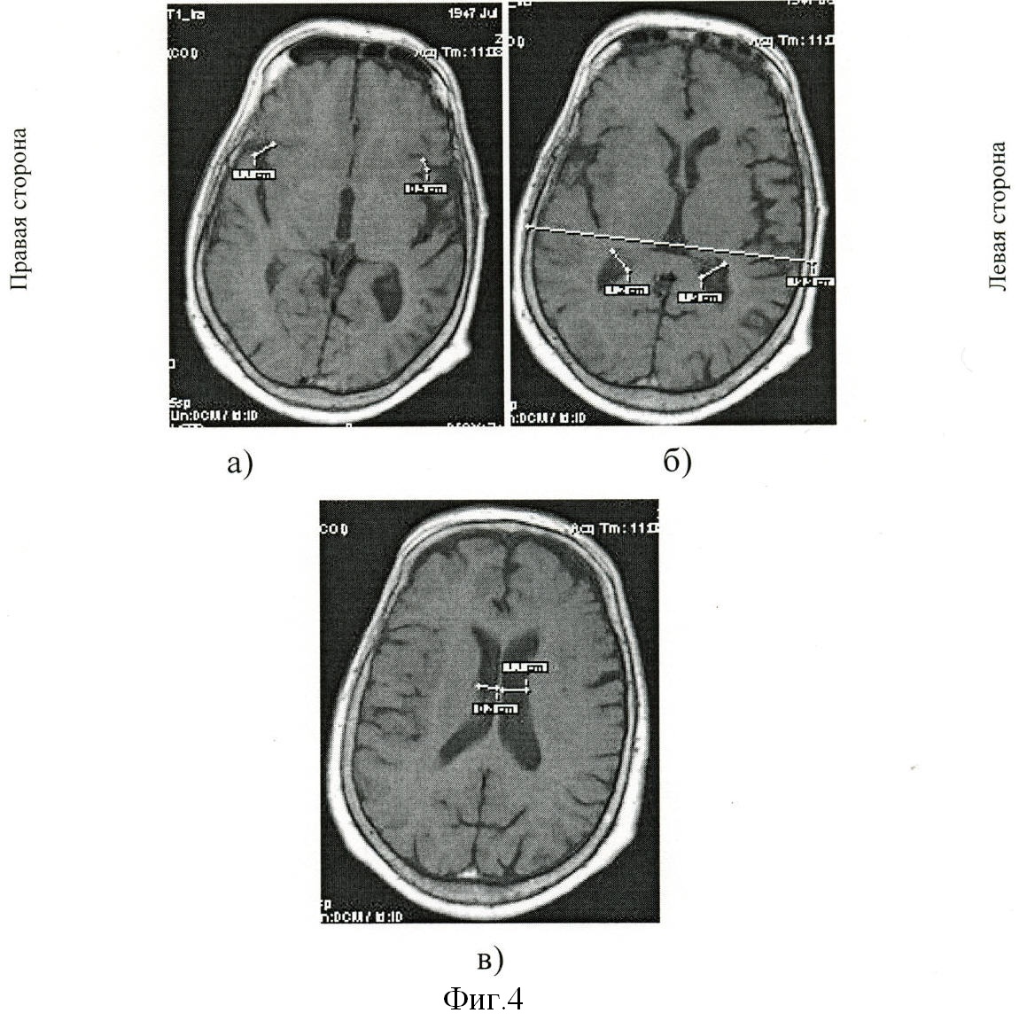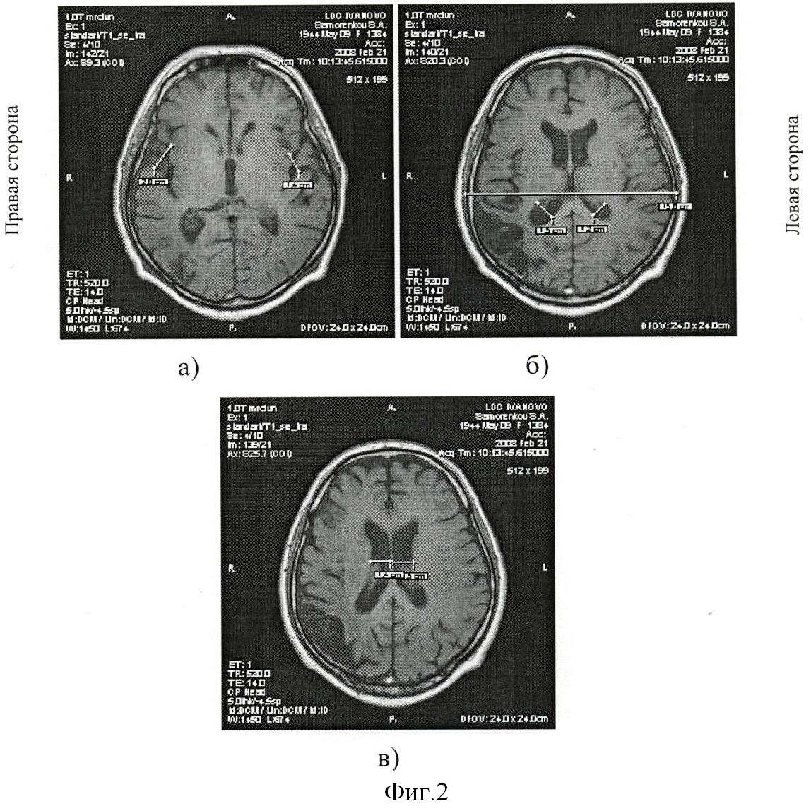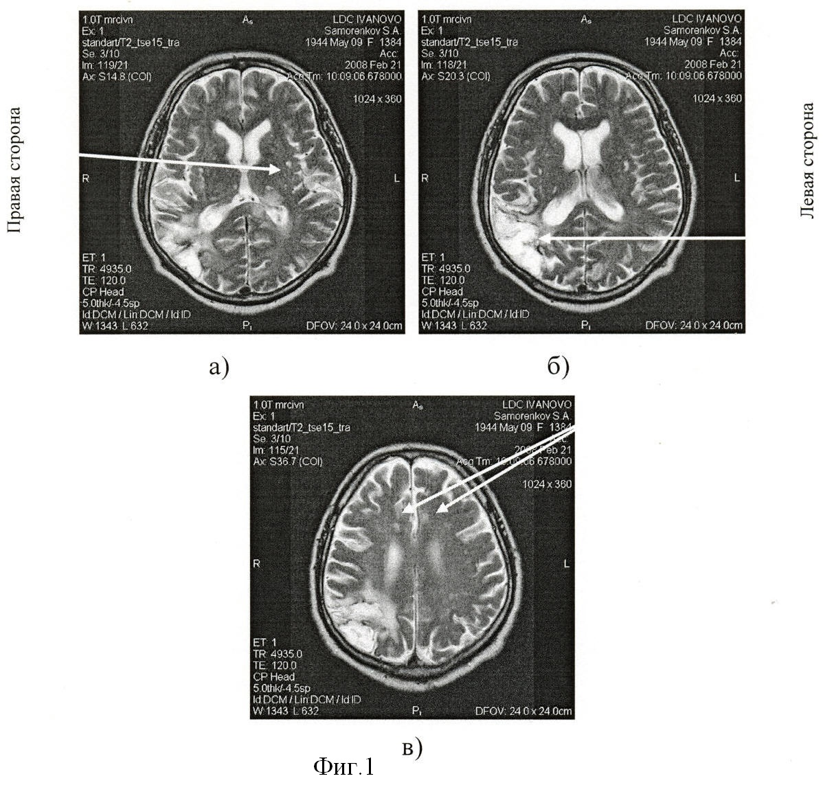 Визуально при магнитно-резонансной томографии выявили: округлая зона (фиг.1а) острого нарушения мозгового кровообращения по ишемическому типу в области таламуса слева размером 2,4×1,4×2,2 см; постишемическая клиновидная киста (фиг.1б) в субкортикальных отделах теменно-височно-затылочной области справа размером 7,3×4,6×6,1 см и множественные мелкие постишемические очаги (фиг.1в) в белом веществе субкортикальных и перивентрикулярных отделов лобных, теменных долей размерами до 0,8 см. Определили наличие смешанной заместительной гидроцефалии. Отметили многоочаговость и асимметричность поражения церебральных структур с локализацией очагов как в базальных отделах, так и субкортикальных зонах обоих полушарий мозга.