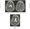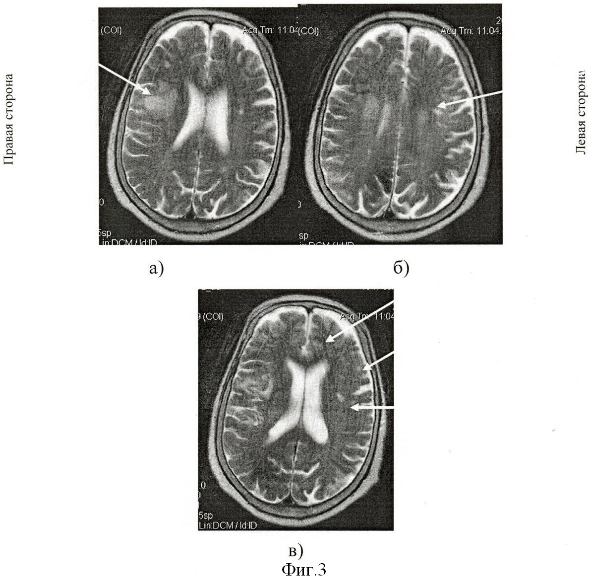 Визуально при магнитно-резонансной томографии выявили в медиобазальных отделах правой теменной доли постишемический очаг с нечеткими неровными контурами (фиг.3а) острого нарушения мозгового кровообращения по ишемическому типу размером 2,9×3,2×2,6 см; в медиальных отделах левой височной доли округлый постишемический очаг с четкими неровными контурами размером 3,5×2,1 см (фиг.3б); в белом веществе субкортикальных отделов лобных и теменных долей множественные мелкие постишемические очаги размерами до 0,4 см (фиг.3в). Определили наличие смешанной заместительной гидроцефалии. Отметили многоочаговость и асимметричность поражения церебральных структур с локализацией очагов как в базальных отделах, так и субкортикальных зонах обоих полушарий мозга.