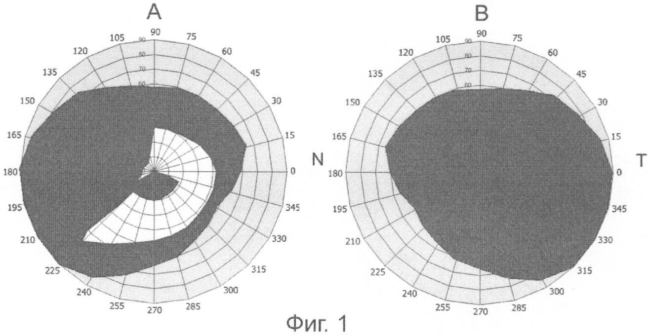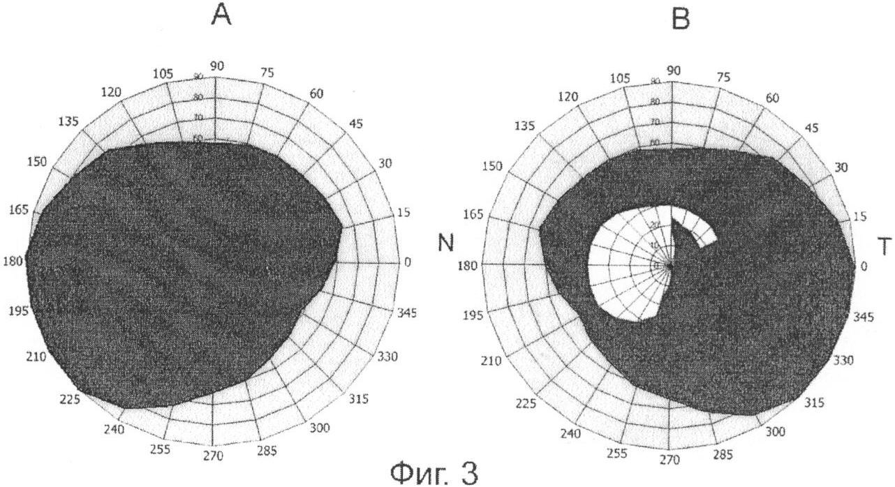 Динамическое КТ исследование головного мозга данных за продолженный рост опухоли не выявило, лечился в глазном отделении краевой больницы – зрительные функции оставались без динамики. Впервые обратился в клинику института 08.10.2004 г. При поступлении острота зрения правого глаза 0,2, левого глаза – амавроз. На фиг.1 представлены поля зрения: справа – остаточное в носовой половине и верхне-височном квадранте, слева – не определяется. Глазное дно: диски зрительных нервов бледные, границы слегка размыты, сосуды сужены. Диагноз: Нисходящая (простая) частичная атрофия зрительного нерва справа и полная – слева. Проведен курс электростимуляций по способу прототипу. Осмотр окулиста. Правый глаз – острота зрения увеличилась до 0,3 при расширении поля зрения в верхне-височном квадранте на 10-15 градусов. Абсолютная парацентральная скотома и ограничение полей зрения по всем меридианам сохранились. Левый глаз – появилось неуверенное светоощущение. Движения глазных яблок в полном объеме, зрачки D=S, реакция на свет слева вялая, справа – живая. Глазное дно: диски зрительных нервов бледные, больше слева, контуры четкие, сосуды сужены. Поля зрения прежние. При повторном поступлении 26.05.2005 г. было проведено лечение согласно заявляемому способу. При диагностическом электрофизиологическом исследовании было установлено, что в проекции правой затылочной доли, соответствующей преимущественному поражению левого зрительного нерва, происходит усвоение ритмов фотостимуляции в диапазоне 4-5 Гц, тогда как в проекции левой затылочной доли – в диапазоне 11, 17, 22 Гц. Вначале при проведении совмещенной световой и электростимуляции, направленных на афферентный зрительный вход пораженного полушария мозга, использованы частоты в 4 и 5 Гц, по 3 импульса в пачке 3-4 сериями, а на афферентный зрительный вход относительно интактного полушария – в 11, 17 Гц по 5 импульсов в пачке в течение 6-7 серий. В процессе контрольного исследования через 6 дней было обнаружено расширение диапазона усвоения фотостимулов в пораженном полушарии до 6-7 Гц, тогда как в интактном полушарии усвоение предъявляемых световых стимулов происходило в диапазоне 10, 11, 20 Гц. На афферентный зрительный вход пораженного полушария начата стимуляция в режимах 6-7 Гц по 4 импульса в пачке в течение 4-5 серий. На зрительный вход интактного полушария режимы совмещенных световых и электрических воздействий оставались в прежних диапазонах.