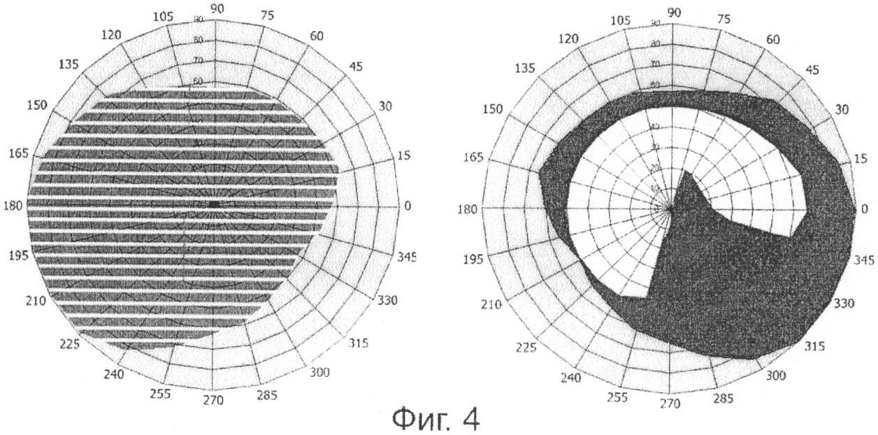 Поле зрения левого глаза – расширение по отдельным меридианам на 5-10 градусов. На третьем курсе стимуляций использован заявляемый способ лечения. При диагностическом исследовании реакции усвоения мозгом предъявляемых световых мельканий было установлено, что в пораженном (правом) полушарии реакция усвоения световых мельканий выявляется в диапазоне 6, 7, 8 Гц, тогда как в относительно интактном полушарии – в диапазоне 10, 15, 20, 22 Гц. На этапе лечебных воздействий на афферентный зрительный вход пораженного полушария мозга использовались частотные режимы 7-8 Гц по 4 импульса в пачке, 4-5 сериями, тогда как на афферентный зрительный вход интактного полушария – 10, 20, 22 Гц по 5 импульсов в пачке, в течение 7-8 серий. При контрольном диагностическом исследовании через 6 дней установлено расширение частотных режимов усвоения предъявляемых фотостимулов в пораженном полушарии от 5 до 9 Гц, а в интактном полушарии, кроме указанных частот, появилась реакция усвоения при предъявлении 11, 12, 24, 26 Гц. Последующие лечебные воздействия на зрительный вход пораженного полушария мозга осуществлялись в частотном диапазоне 6-9 Гц по 5 импульсов в пачке 4-5 сериями, а на зрительный вход интактного полушария – с частотами 12, 24 Гц по 6 импульсов в пачке на протяжении 7-8 серий. Осмотр окулиста после курса лечения. Справа появилось предметное зрение – счет пальцев с 2 метров, что соответствует остроте зрения 0,02. Острота зрения левого глаза восстановилась до 0,9-1,0. Глазное дно – без динамики. На фиг.4 отображены поля зрения. Справа определение поля зрения затруднено из-за низкой остроты зрения. Поле зрение левого глаза – расширение в носовой половине на 10-20 градусов и в верхне-височном квадранте – на 20-40 градусов при сохранении абсолютной скотомы в височной половине.