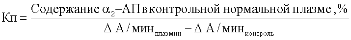 Каждая серия анализов требует не менее одного значения для раствора плазмина ( А/мин плазмин) и одного референтного значения, определяемого с использованием контрольной нормальной плазмы ( А/мин контроль) с известным значением 2-АП. Эти значения используют для вычисления внутрилабораторного коэффициента пересчета (Кп):