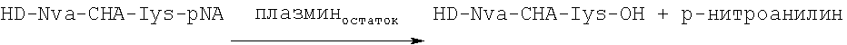 Используются следующие реактивы: 1. Плазмин свиньи или быка, лиофилизированный, соответственно. Разводится в буфере до концентрации 0,1 СТА Е/мл. 2. Хромогенный субстрат D-Norvalylcyclohexylalanillysil-p-nitroanilide. Разводится в дистиллированной воде до концентрации 3 ммоль/л. 3. Раствор буфера: KH2PO4 (100 ммоль/л), NaCl 9 г/л, глицерин (250 г/л), рН 7,5.