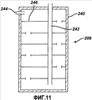 Подобная конструкция с подводом также может быть применена в первом испарителе/конденсаторе 208. На фиг.11 представлен простой вариант воплощения первого конденсатора/испарителя 208. Он содержит корпус 240, имеющий подвод 242, соединенный с источником раствора 204 (на фиг.11 не показан), и отвод 244, соединенный с камерой 200 (на фиг.11 не показана). Множество лопаток 246 обеспечивает извилистый путь прохождения потока через первый испаритель/конденсатор 208. Температурой корпуса 240 и потенциально лопаток 246 можно управлять для усиления конденсации и повторного испарения раствора.