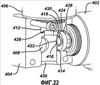 На фиг.22 наилучшим образом представлен клапан 402 управления диафрагмой. Клапанное седло 418 на клапанном блоке 404 окружает диафрагму 416. Клапанный элемент 420 на клапане 402 может проходить к седлу 418 для уплотнения относительно него и блокирования движения текучей среды через диафрагму 416. Очистной палец 422 проникает в диафрагму 416, когда клапан 402 закрыт, для очистки диафрагмы 416 и сохранения ее в чистом состоянии без посторонних веществ. Кольцевая направляющая 424, подсоединенная к клапанному элементу 420, скользит внутри отверстия 426 в клапанном блоке 404 для соответствующего совпадения очистного пальца 422 с диафрагмой 416. На этом виде также показано клапанное седло 428 для выпускного управляющего клапана 406 и выпускной канал 430 клапанного блока, который ведет к стерилизационной камере (на фиг.20-22 не показана).
