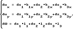 Если Oxy – связанная с манипулятором система координат в опорной плоскости, то могут быть вычислены величины![]() где dux и duy – составляющие поступательного движения точки манипулятора в системе координат Oxy, d – элемент вращательного движения манипулятора относительно оси, перпендикулярной опорной поверхности; k1x, k1y, k2x, k2y, k3x, k3y, l1, l2, l3 – фиксированные для данного манипулятора константы, определяемые размещением и ориентацией колесных датчиков на манипуляторе, а также выбором системы координат.