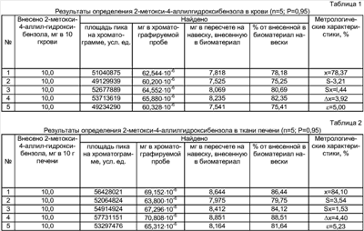 Способ характеризуется недостаточно высокой чувствительностью. Задачей настоящего изобретения является повышение чувствительности определения. Поставленная цель достигается с помощью предлагаемого способа, который заключается в том, что биологический объект двукратно по 30 минут обрабатывают этилацетатом, этилацетатные извлечения объединяют, обезвоживают, этилацетат испаряют вначале в токе воздуха при температуре 18-22°С до незначительного объема, затем в токе азота до полного удаления растворителя, остаток растворяют в гексане, экстрагируют буферным раствором с рН 12-13, водно-щелочное извлечение отделяют, подкисляют до рН 2-3, насыщают сульфатом натрия, экстрагируют диэтиловым эфиром, эфирное извлечение отделяют, обезвоживают, упаривают токе воздуха до незначительного объема, а затем в токе азота до полного удаления растворителя, остаток растворяют в смеси растворителей гексан-диоксан-пропанол-2 (40:5:1), хроматографируют в макроколонке с силикагелем с использованием подвижной фазы гексан-диоксан-пропанол-2 (40:5:1), фракции элюата, содержащие анализируемое вещество, объединяют, элюент испаряют в токе воздуха при температуре 18-22°С до незначительного объема, затем в токе азота до полного удаления растворителя, остаток растворяют в гексане и проводят определение хромато-масс-спектрометрическим методом с применением капиллярной колонки длиной 30 м и внутренним диаметром 0,25 м.м с неподвижной фазой HP – 5/MS, содержащей полиэтиленгликоль и силоксан в массовом отношении 95:5, используя газ-носитель гелий, подаваемый со скоростью 1 мл в минуту, и масс-селективный детектор, работающий в режиме электронного удара, с регистрацией масс-спектра по полному ионному току, количество 2-метокси-4-аллилгидроксибензола вычисляют из данных хроматограммы, полученной регистрацией интенсивности сигнала, обусловленного заряженными частицами, образующимися при бомбардировке анализируемого вещества, вышедшего из капиллярной колонки и попавшего в источник ионов, ионизирующим пучком электронов с энергией 70·эВ. Способ осуществляется следующим образом: биологический материал, содержащий 2-метокси-4-аллилгидроксибензрл, дважды (каждый раз в течение 30 минут) настаивают с этилацетатом при перемешивании, отдельные извлечения отделяют от твердых частиц биологического материала, объединяют, обезвоживают безводным сульфатом натрия, этилацетат испаряют при 18-22°С в токе воздуха до незначительного объема, а затем в токе азота до полного удаления растворителя, остаток растворяют в гексане, экстрагируют буферным раствором с рН 12-13, водно-щелочное извлечение отделяют, подкисляют до рН 2-3, насыщают сульфатом натрия, экстрагируют диэтиловым эфиром, эфирные извлечения отделяют, обезвоживают, упаривают при 18-22°С в токе воздуха до незначительного объема, а затем – в токе азота до полного удаления растворителя, остаток растворяют в смеси растворителей гексан-диоксан-пропанол-2 (4.0:5:1), хроматографируют в макроколонке с силикагелем с использованием подвижной фазы гексан-диоксан-пропанол-2 (40:5:1), фракции элюата, содержащие анализируемое вещество, объединяют, элюент испаряют вначале в токе воздуха при температуре 18-22°С до незначительного объема, затем в токе азота до полного удаления растворителя, остаток растворяют в гексане и проводят определение хромато-мас