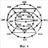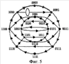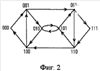 Для демонстрации применения алгоритма определяем кратчайший путь движения ПО (например, судна), следующего из вершины 1100 в вершину 0001 в ориентированном ГКП (4, 2, 1) (фиг.4). В соответствии с алгоритмом в начале определяем число символов в пересечении двух соседних кодовые комбинаций n-r=4-1=3. При существовании пути непосредственно из вершины 1100 в вершину 0001 три последних символа кодовой последовательности 1100 совпадают с тремя первыми символами кодовой последовательности 0001. Это условие не выполняется, следовательно, пути из точки 1100 в точку 0001 длиной l=1 не существует. В этом легко убедиться по чертежу (фиг.4). Вычисляем n-r-1=4-1-1=2. При существовании пути длиной l=2 два последних символа кодовой последовательности 1100 совпадают с двумя первыми символами кодовой последовательности 0001. Замечаем, что это условие выполняется. Следовательно, должен существовать путь длиной l=2 из вершины 1100 в вершину 0001. Для его определения составляем из номеров 1100 и 0001, совместив совпадающие символы, последовательность 110001, которая и является сокращенной записью кода полного пути ранга l=2 из точки 1100 в точку 0001. Читаем эту последовательность слева направо по n=4 символов с шагом в r=1 символов: