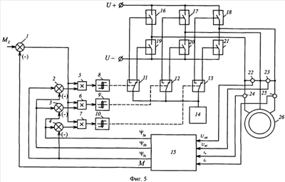– для управления ЭМ (фиг.5): при помощи суммирующих 1, 2, 3, 4 и перемножающих элементов 5, 6, 7 вычисляются значения выражений ( Sc– Sb)(MZ-М), ( Sa– Sc)(MZ-М), ( Sb– Sa)(MZ-М), затем вычисленные значения подаются на вход элементов сравнения 8, 9, 10, где сравниваются с 0 (если значение сигнала больше 0, то на выходе элемента сравнения формируется сигнал логической 1, если меньше или равно 0, то формируется сигнал логического 0), сигналы с выходов блоков 8, 9, 10 действуют на переключатели 11, 12, 13, подключающие устройство управления 14, выдающее сигнал логической 1 при разрешении работы, либо логического 0 при запрете, к одному из двух ключей плеч инвертора 16-19, 17-20, 18-21 (если на ключ подается сигнал логической 1, то ключ замыкается, иначе, размыкается), в результате чего напряжение U подается на обмотки статора ЭМ, и формируется вектор напряжения статора, необходимый для поддержания заданного электромагнитного момента MZ,