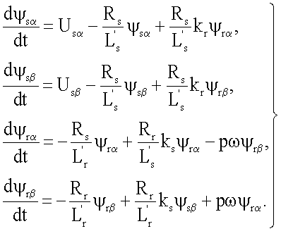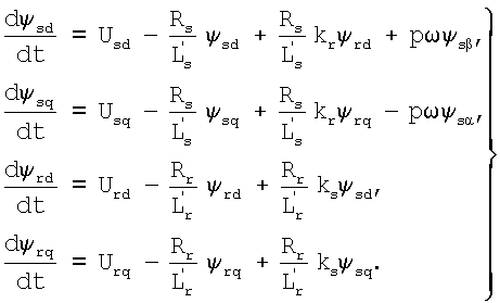 Здесь параметры, начинающиеся с R и индексами s, r – активные сопротивления обмоток статоров и роторов ЭМ, L’S, L’r – переходные индуктивности статора и ротора, kr, ks – коэффициенты электромагнитной связи, р – число пар полюсов, – геометрическая угловая скорость вращения ротора электродвигателя, S r с индексами , , d, q – составляющие потокосцеплений статора и ротора по осям соответствующей системы координат, Us, Ur с индексами координатной системы – составляющие напряжений статора и ротора.